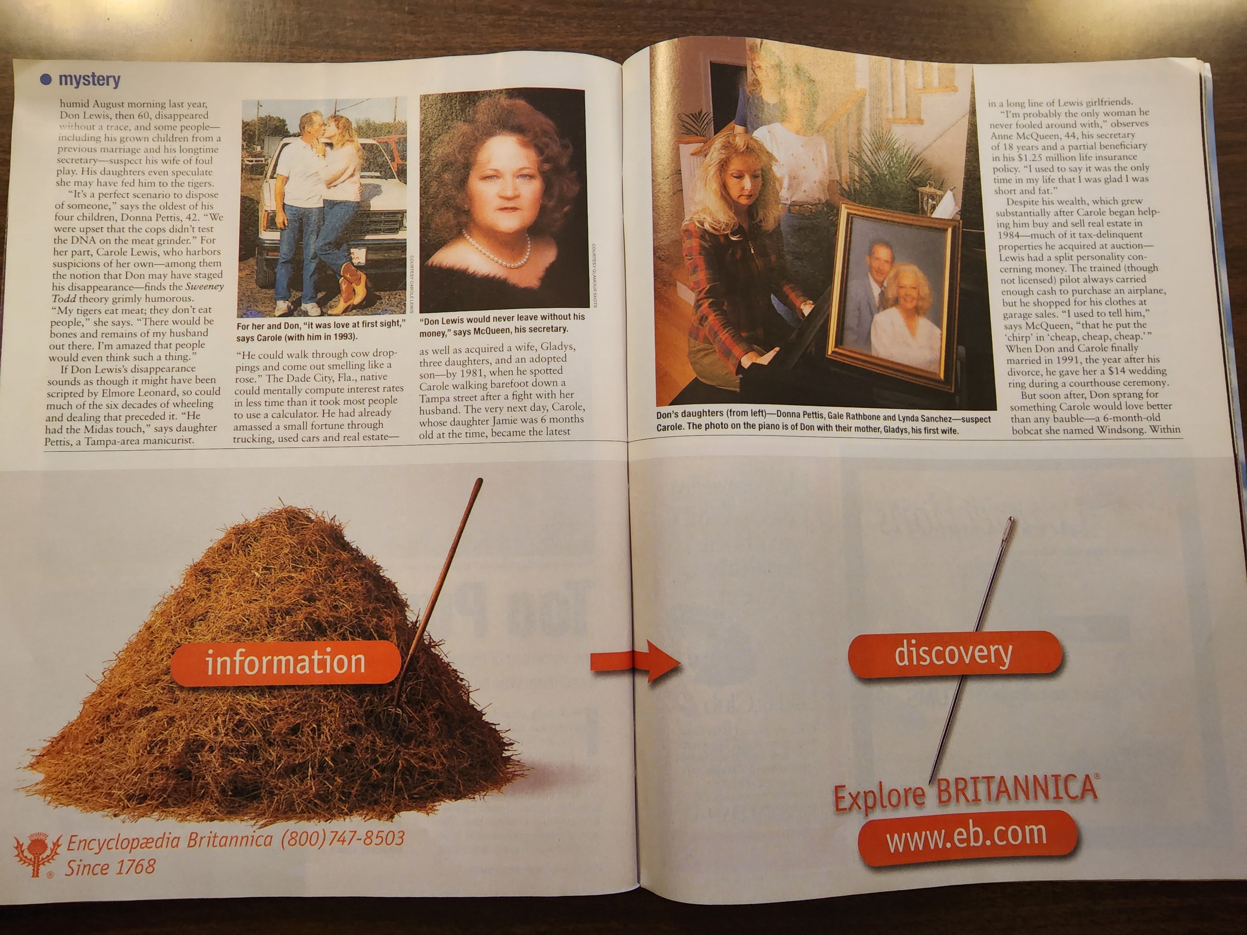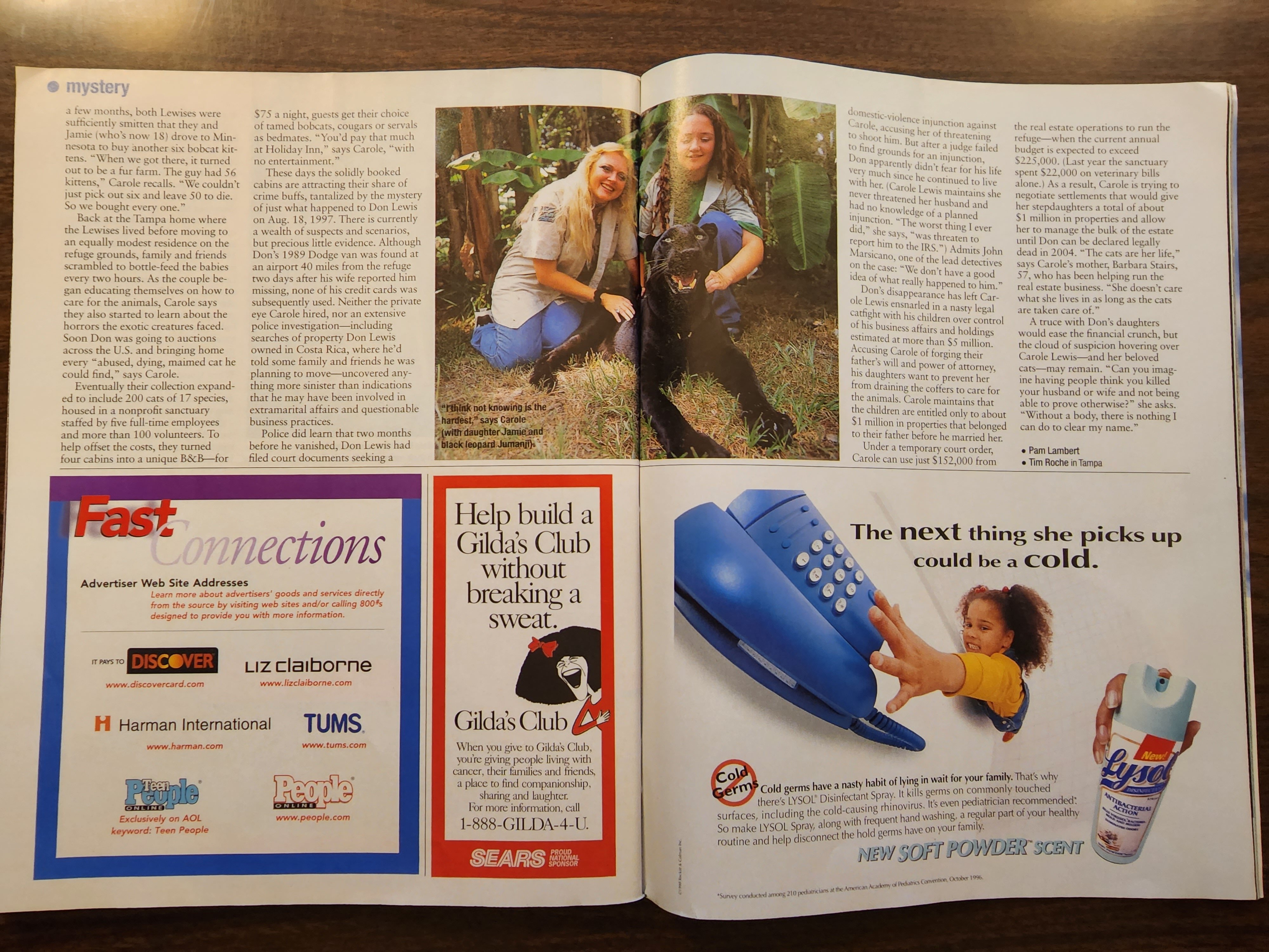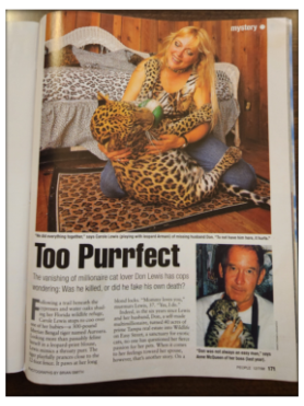 The disappearance and alleged murder of millionaire Don Lewis, the husband of Carole Baskin, (and at that time Carole Lewis) was unfolding just before the internet capabilities back in 1997-1998. This report was printed in “People Weekly Magazine” – December 7, 1998.